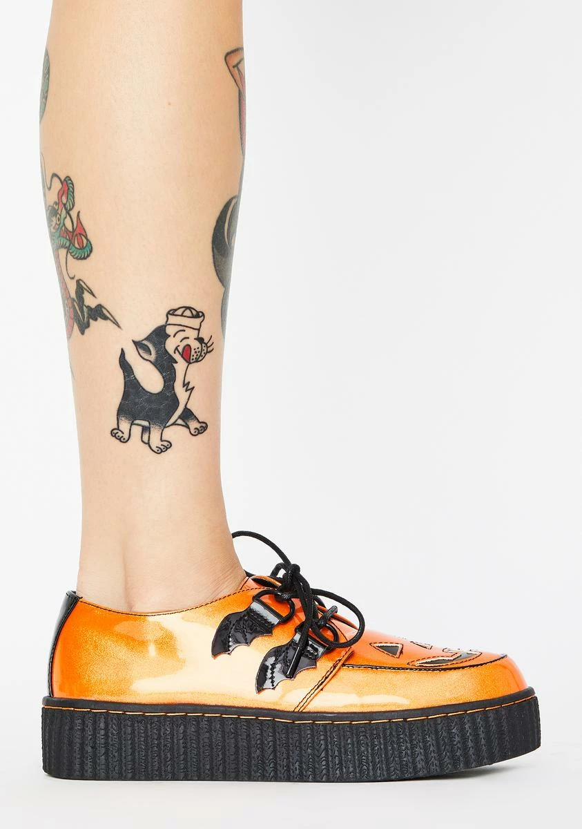 cuz yer a freak in the night! Spook âem with these jack-o-lantern creepers that have a patent vegan leather construction, bat wing D-ring details, and adjustable lace-up closures.