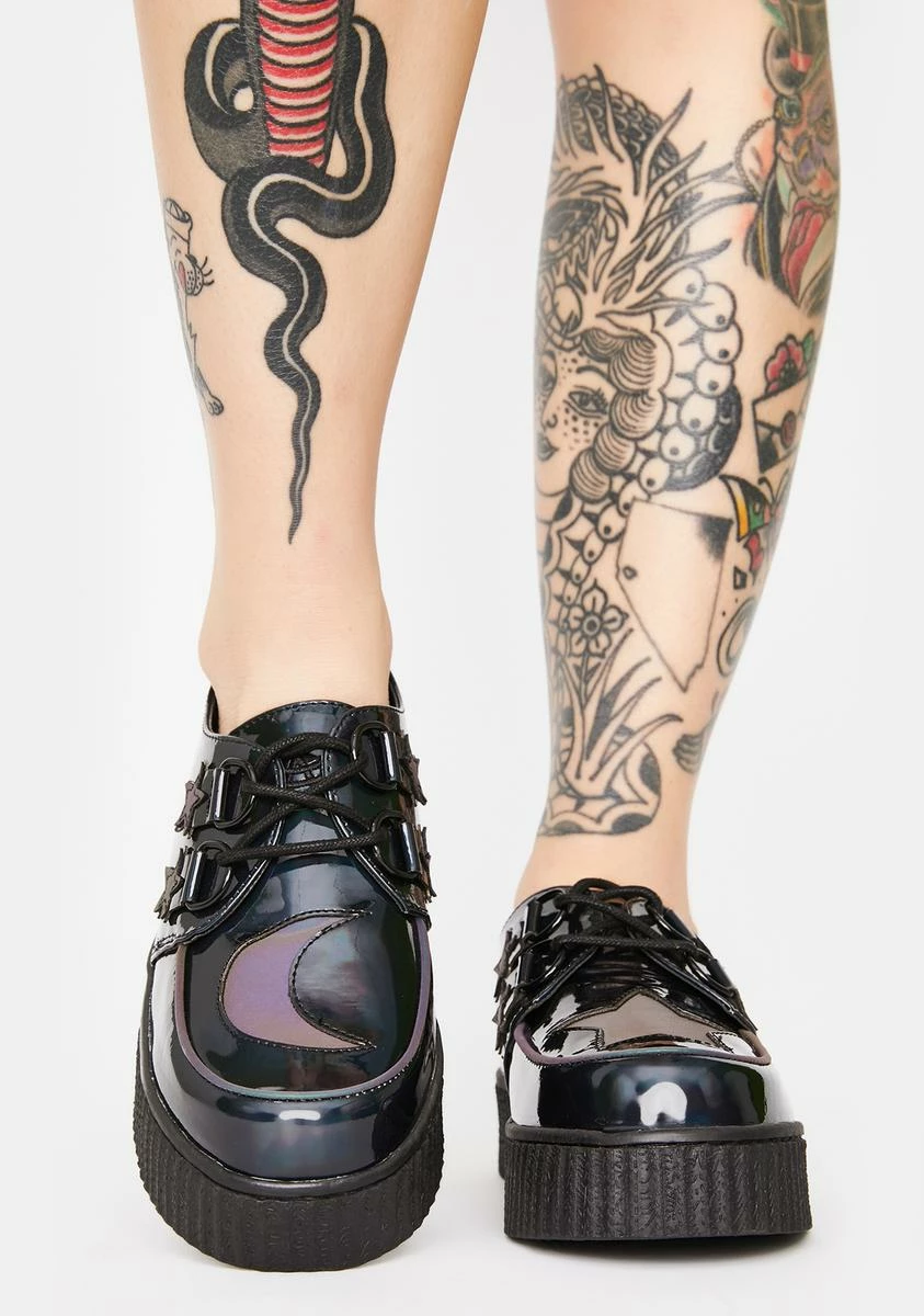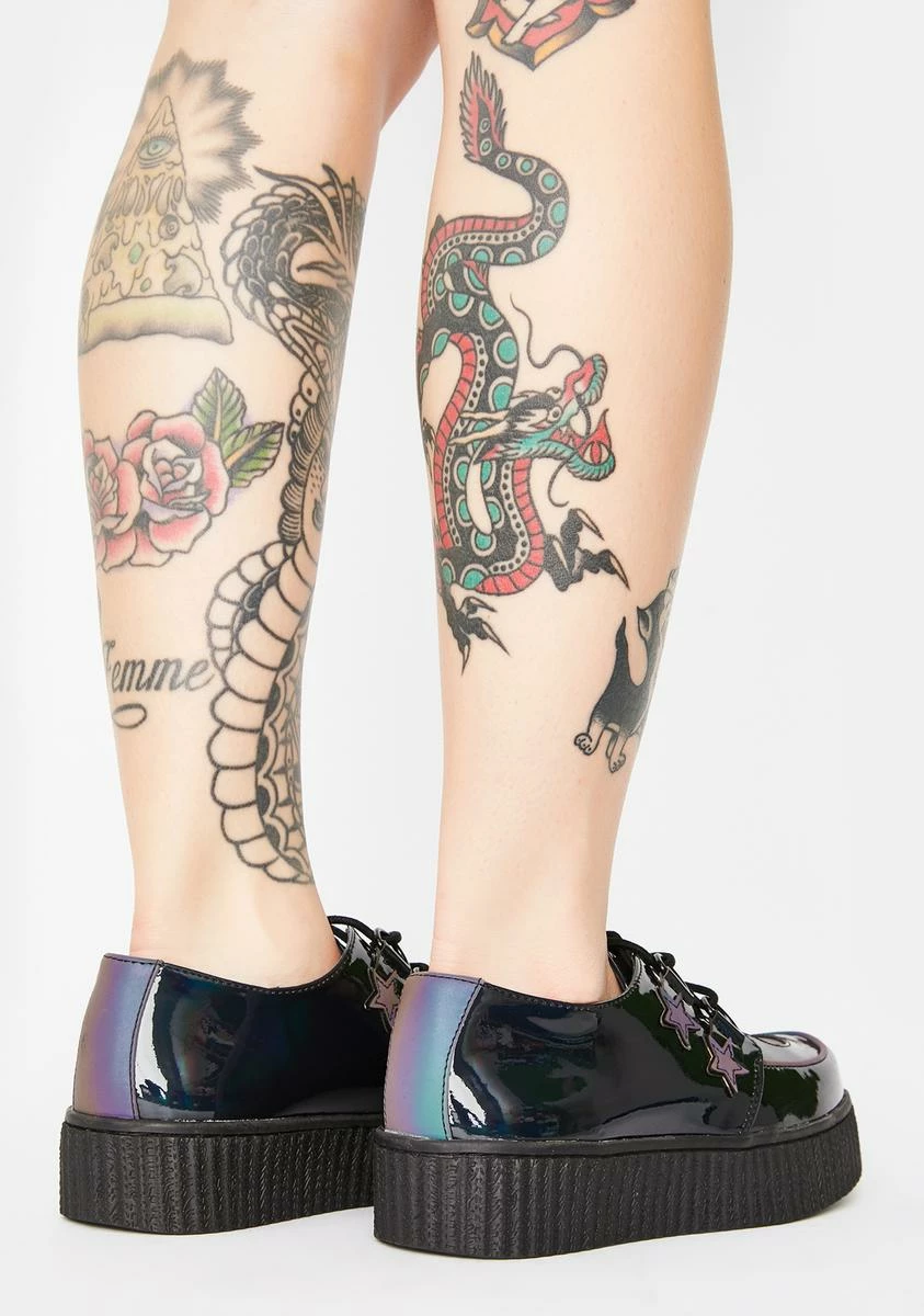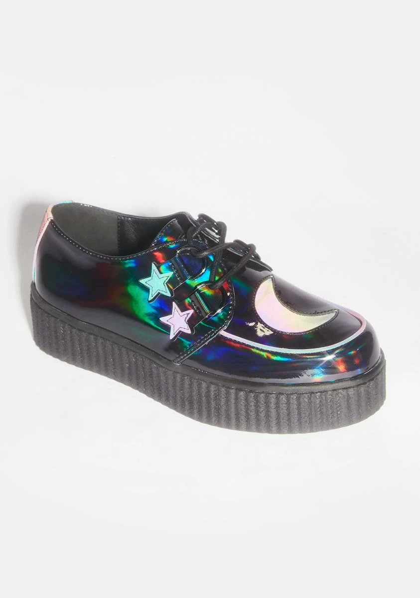 got ya lookin’ wicked pretty, bb! Show ‘em sum of that magic while lookin’ cute in these holographic creeper shoes with a platform sole, reflective star n’ moon decals all over it.