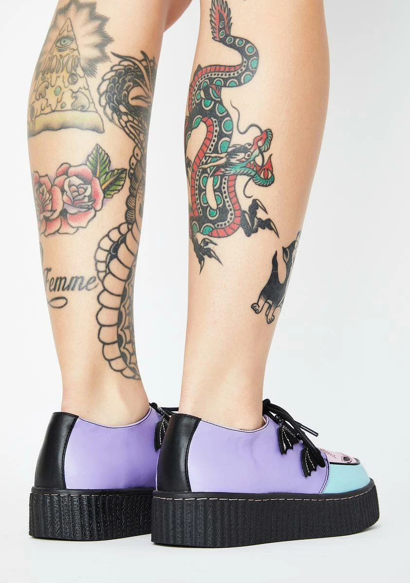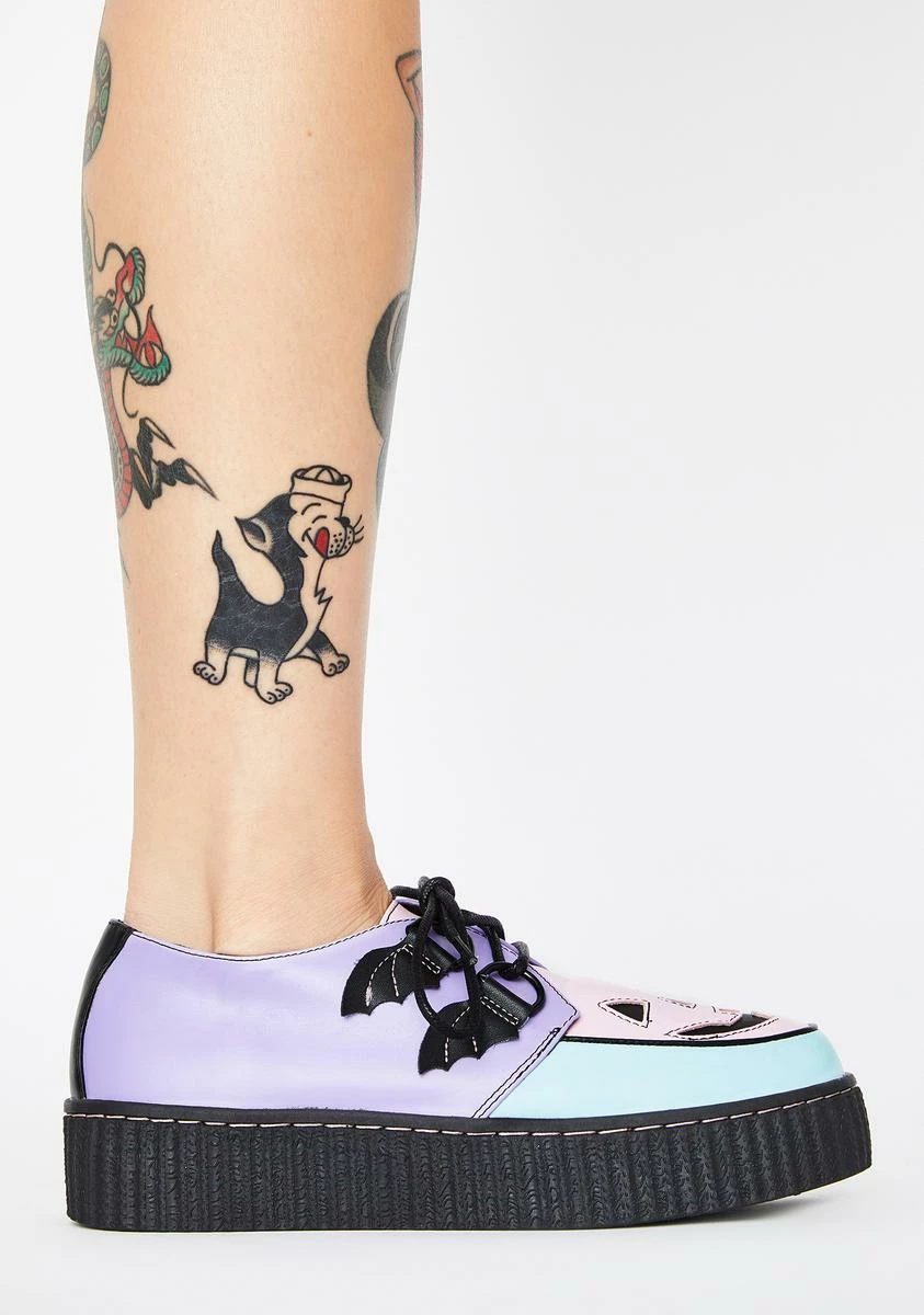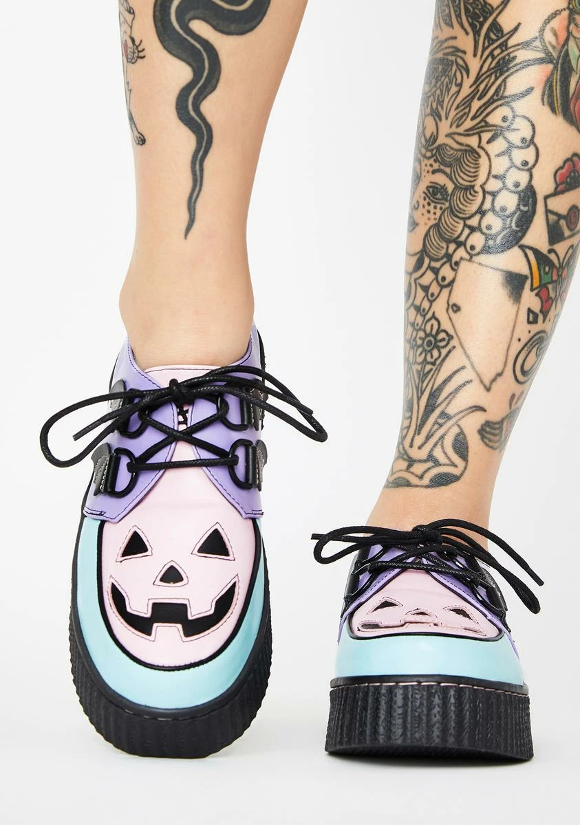 got ya hauntinΓ’ΒΒ the streets, boo! ItΓ’ΒΒs trick or treat in these spooky cute creepers that have a jack-o-lantern cut out construction, bat wing D-ring hooks, chunky ribbed platform soles NΓ’ΒΒ adjustable lace-ups.
