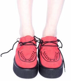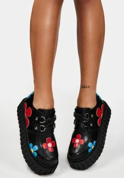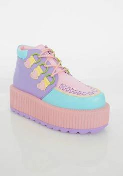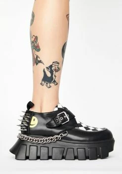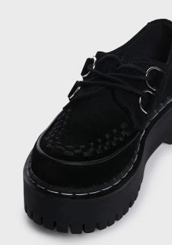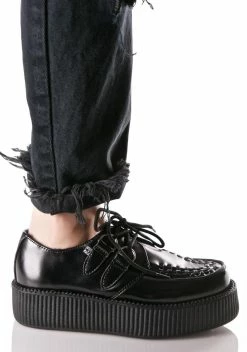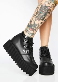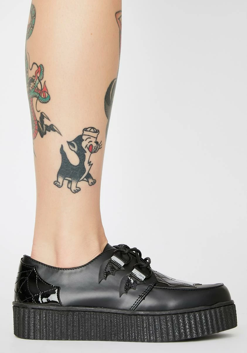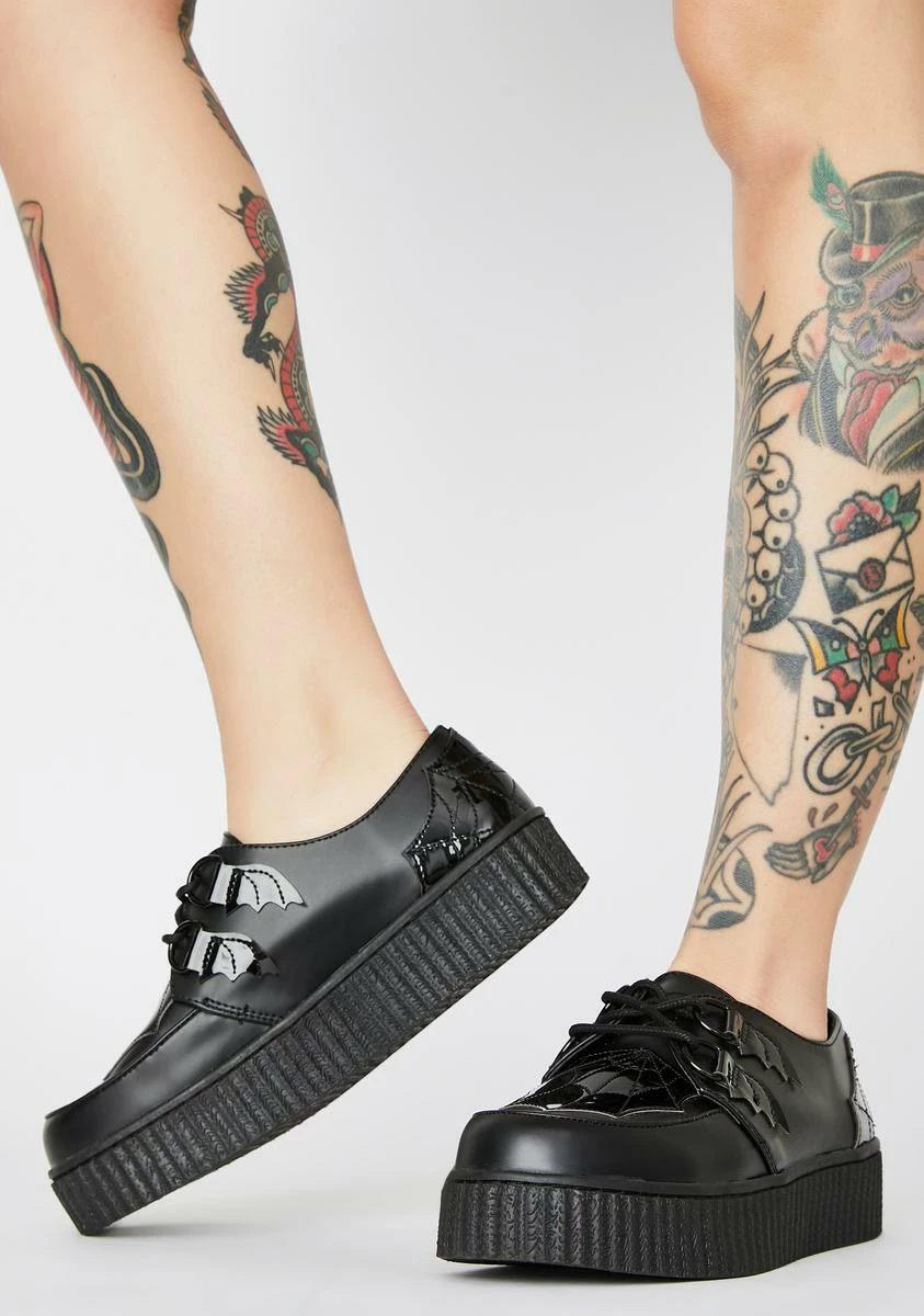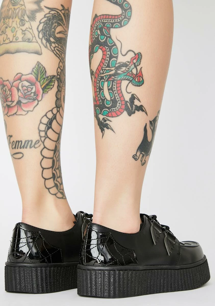 if ya can’t fool ‘em, spook ‘em. Make their skin crawl in these sikk creepers that have a vegan leather construction with ribbed platform soles, patent spider web designs all ova and adjustable lace-ups.