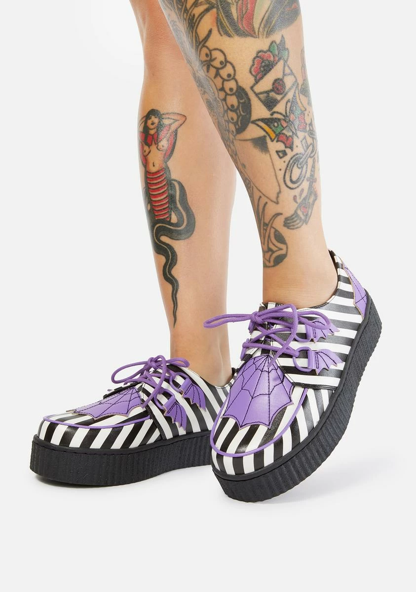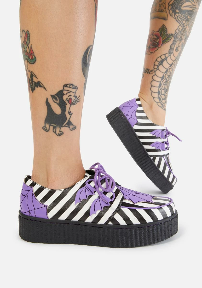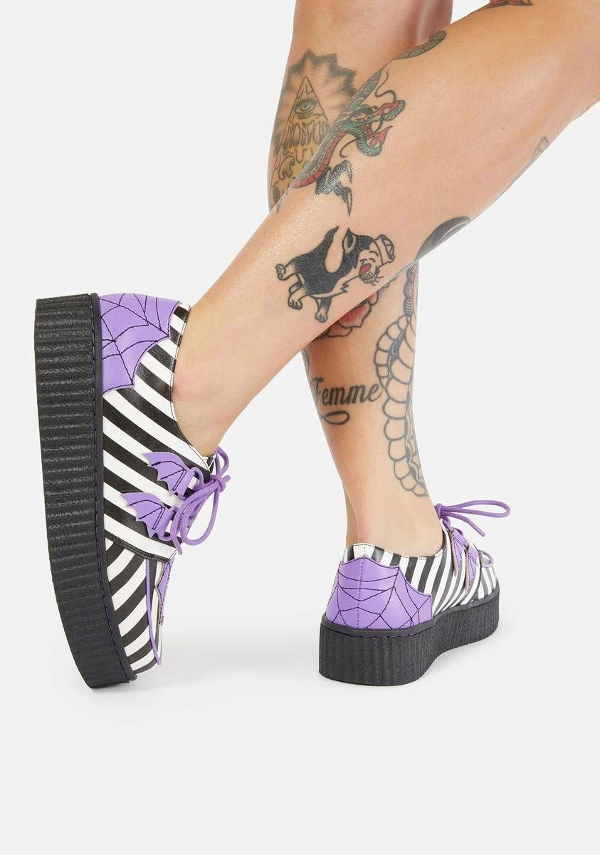 haunt their dreams til the end. These witchy creepers have classic ribbed platform soles, bat wing and spider web designs, a striped pattern and adjustable lace up closures.