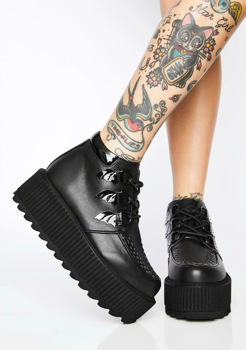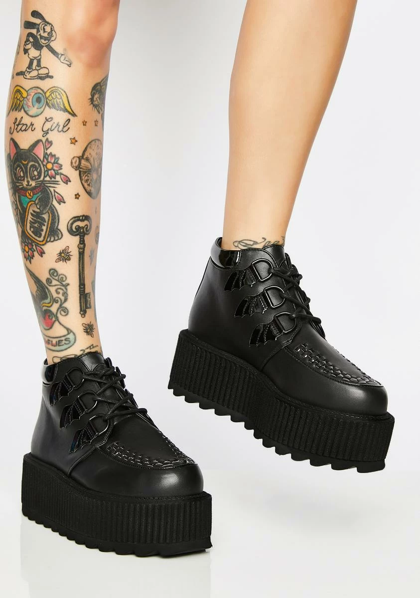cuz you’re the cutest creep around. Get sky high in these dope platform creepers that have bat wings on the sides, a woven top design, and lace up closures.