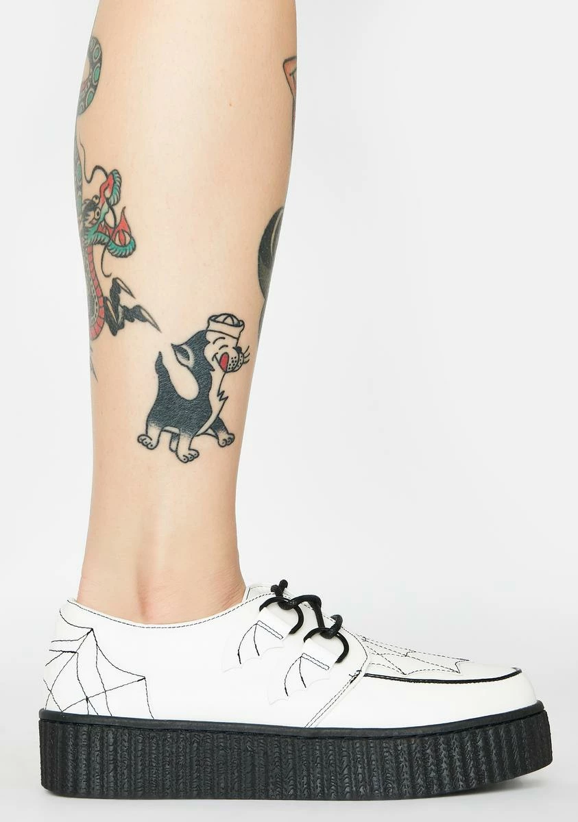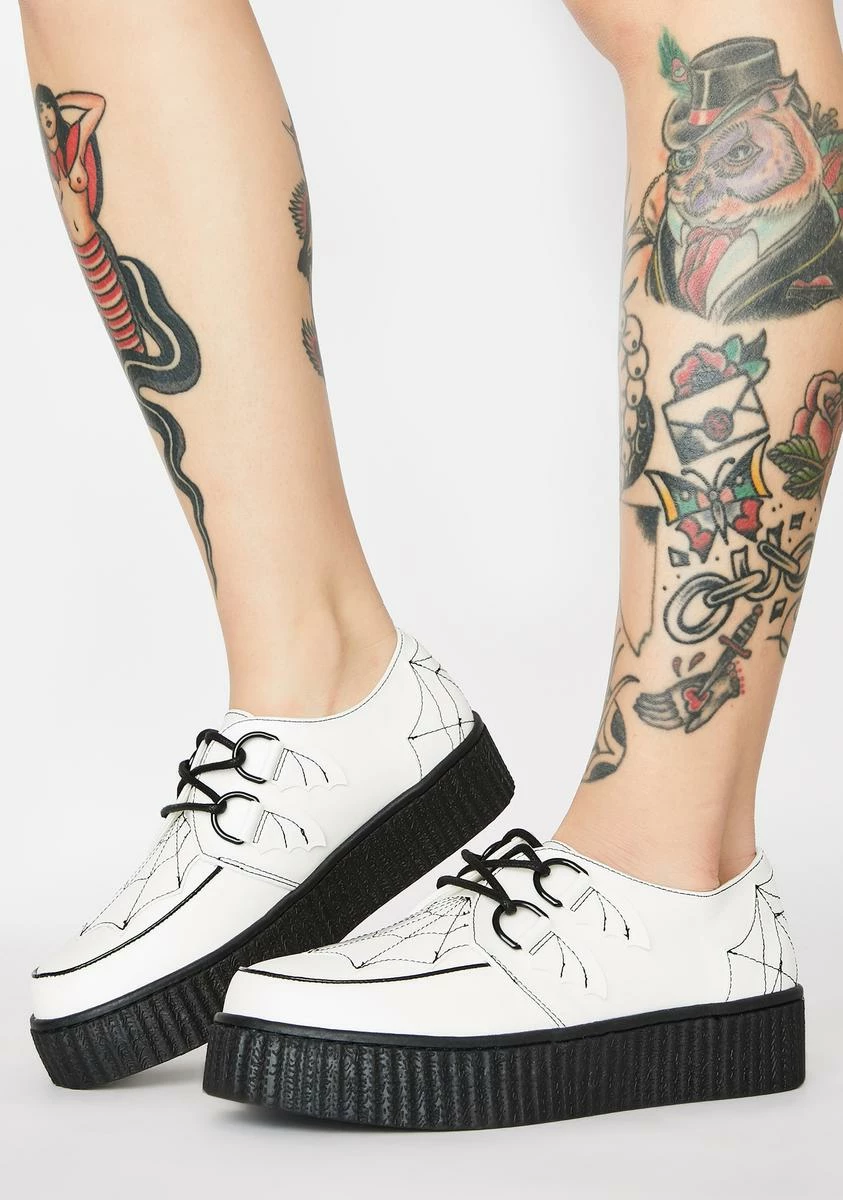 got those spidey senses tingling, bb! Yer servinΓ’ΒΒ some serious lewks in these kreepers that have a vegan leather construction, a bat wing d-ring detail, and an embroidered spider webs all ova.