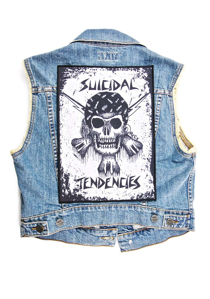 will let ‘em know who ya roll with, bb. This dope patch covers yer whole back, and features classikk Suicidal Tendencies logos ‘N skulls that’ll terrorize the town.