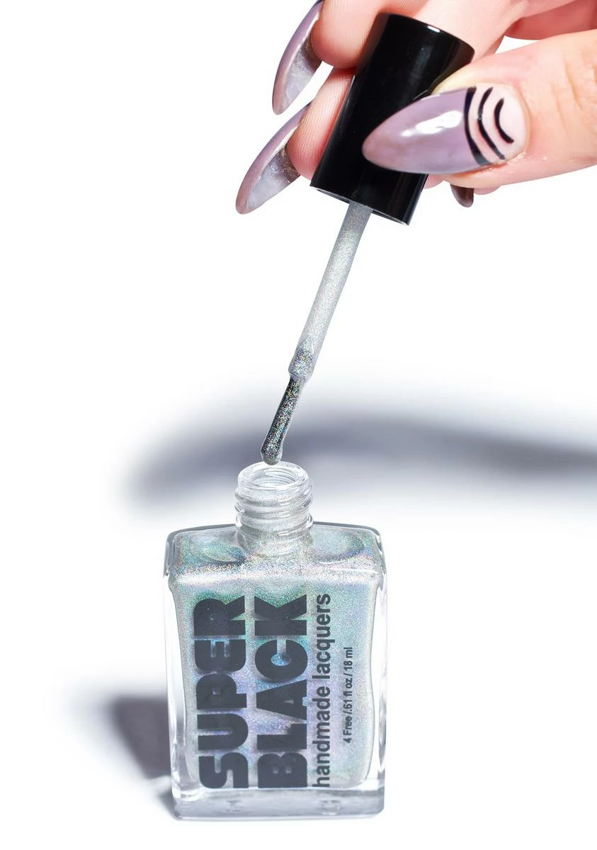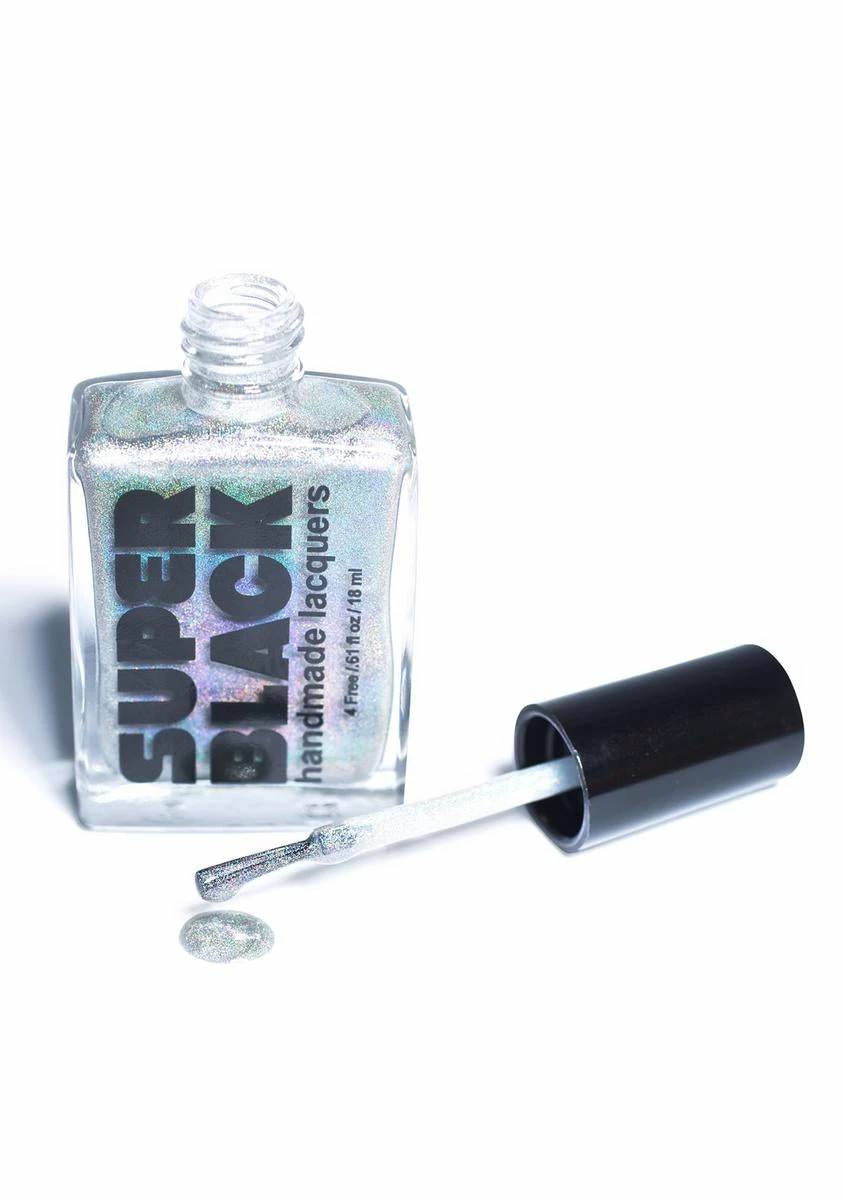 SUPER BLACK Wishful Thinking Top Coat Nail Polish, wishing upon a star for that perfect holographic polish, bby? This superb hologram shade is pure perfection any way you wear it, either as a top coat for yer favorite polish or let it shine all alone. Drying to a flashy semi-matte shine, this 100% vegan exxxtra pigmented formula ensures this prismatic polish will make yer nail dreams come true.