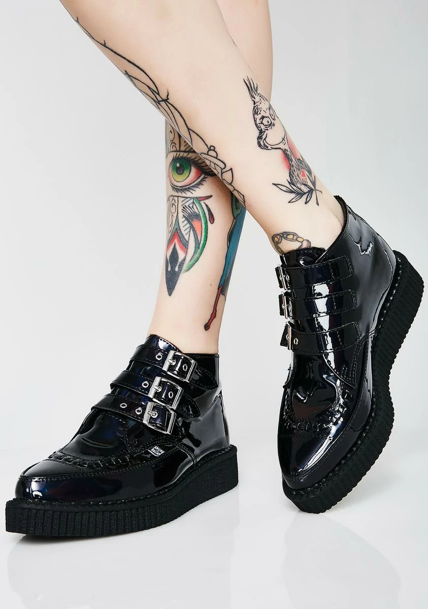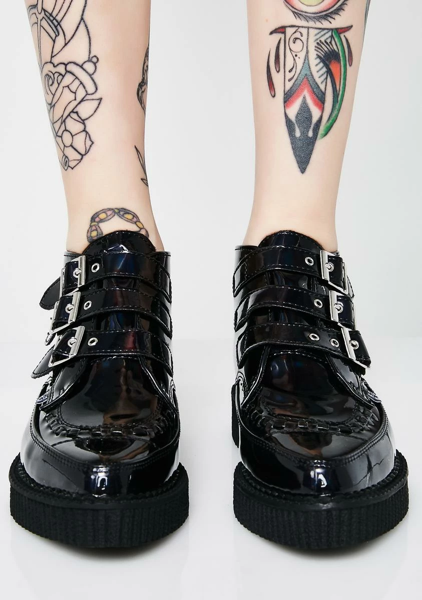 cuz youΓ’ΒΒre dope af! Get to steppinΓ’ΒΒ with these vegan patent leather creepers that have a black hologram detail all ova, comfy rubber soles and buckle closures on the sides.
