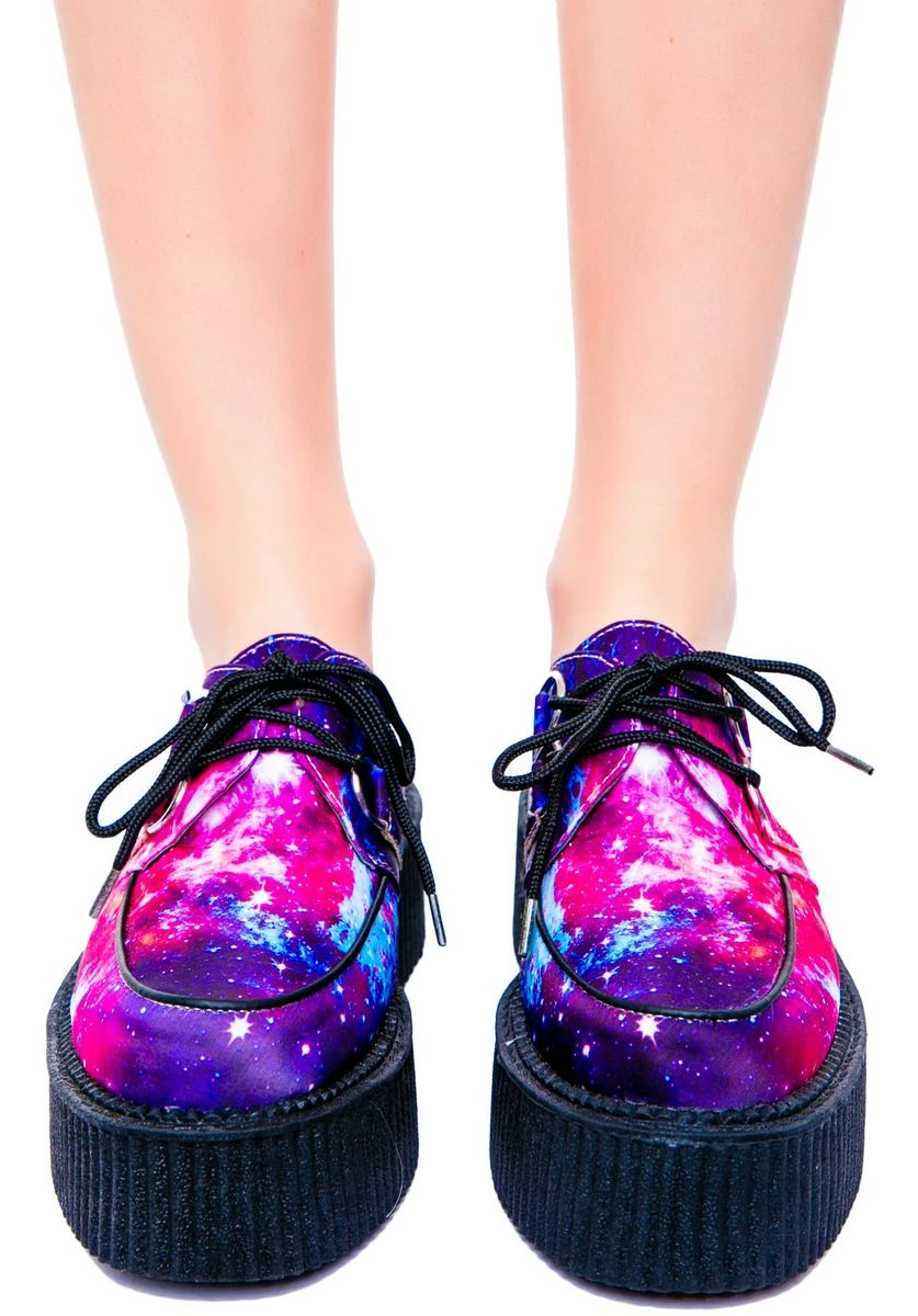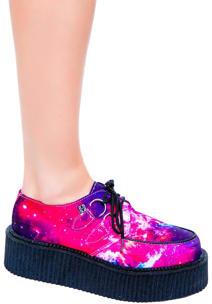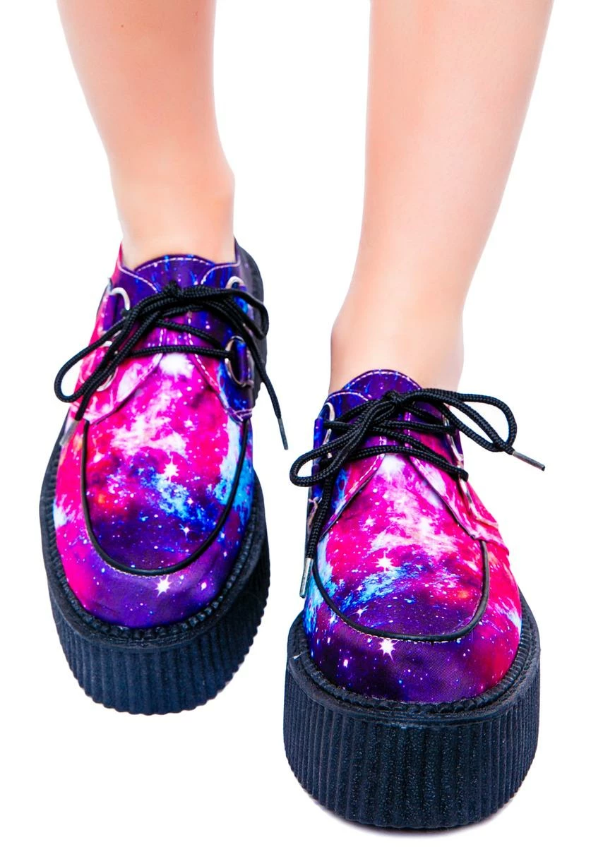 T.U.K. Galaxy Round Mondo Creeper is so out of this world itΓΒs extraterrestrial. These way out there creepers are made to last with their rubber composite sole, and 2 heavy duty D-ring lacelets. Their interstellar print textile upper is assembled into the sole with direct inject reinforced seams, and contrasting black toe band that matches their set of black round laces. These universal punk rock creepers are an essential addition to any alien or misfitΓΒs wardrobe.