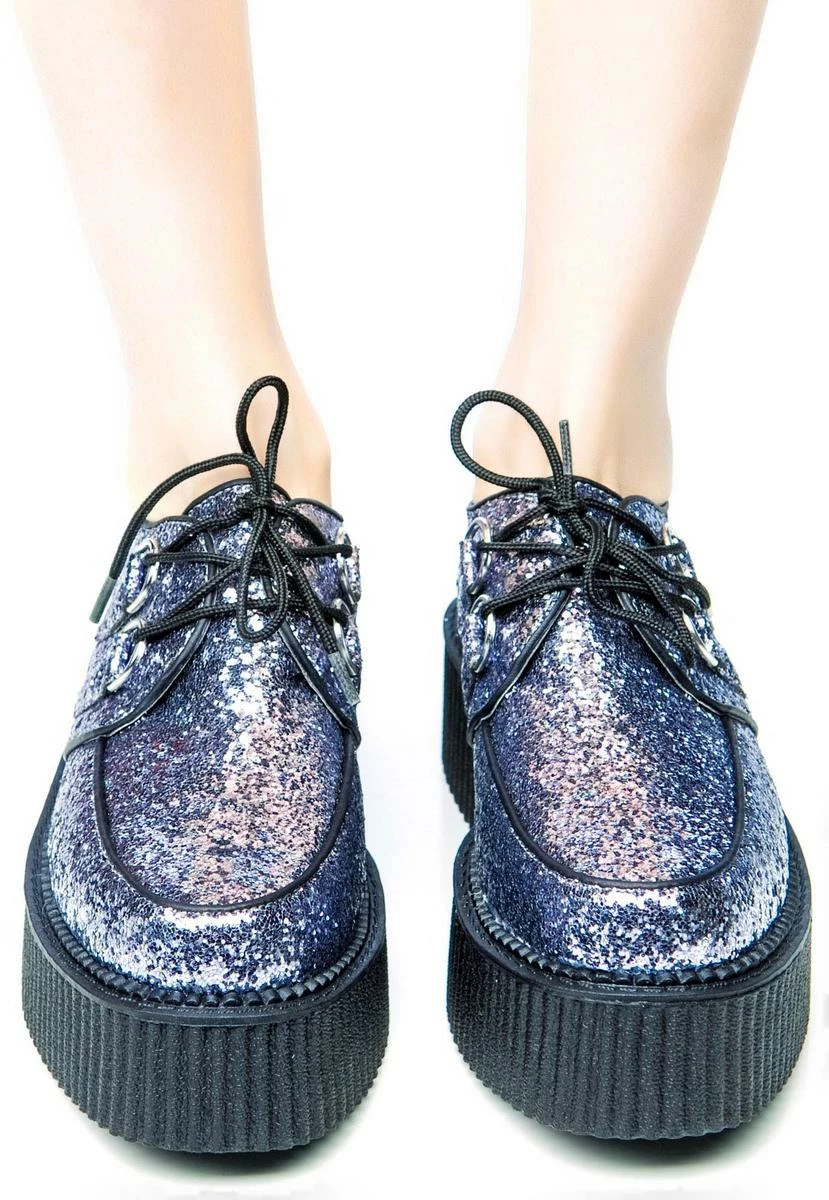 T.U.K. Glitter Mondo Round Creepers combine old school underground punk with glam flipping rock. Adding some sparkle to your swag, this glitter creeper will def give you height thanks to the super tall sole. Featuring a rounded toe, lace ups with d-rings and a contrast platform. Freakishly comfortable. You’ll feel like you’re romping around in sneakers. Add some serious glitter to any look and get ready to party. Contrast black trim.