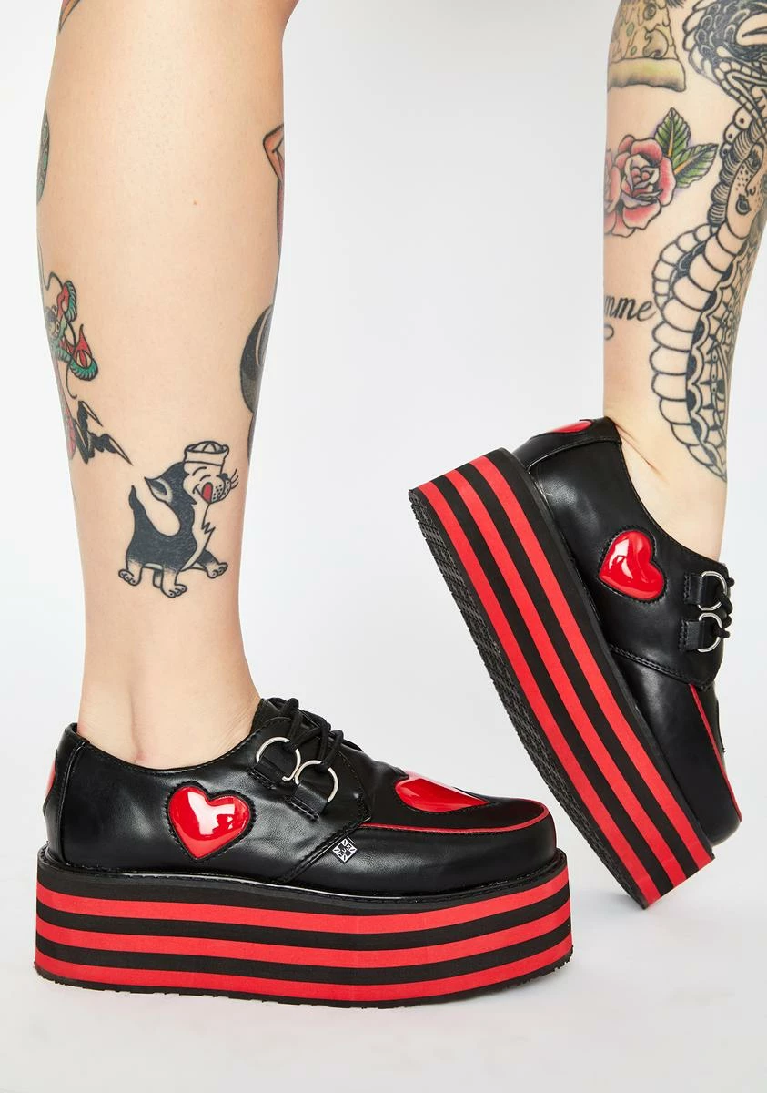 will take your love to a new level, babe! Catch feelings in these smooth vegan leather creepers that have striped platform soles, patent heart accents, adjustable lace-up closures NΓ’ΒΒ removable memory foam padding for exxxtra comfort.