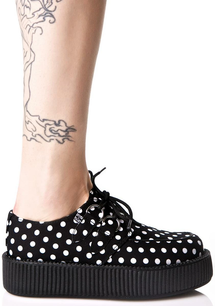 are gunna trick yer eyes, bb! This adorable take on tha classic creeper style features sleek black Γ’ΒΒN white polka dot patterning, vegan leather trim, classikk textured platform, a cushioned footbed, and D-ring lace ups.