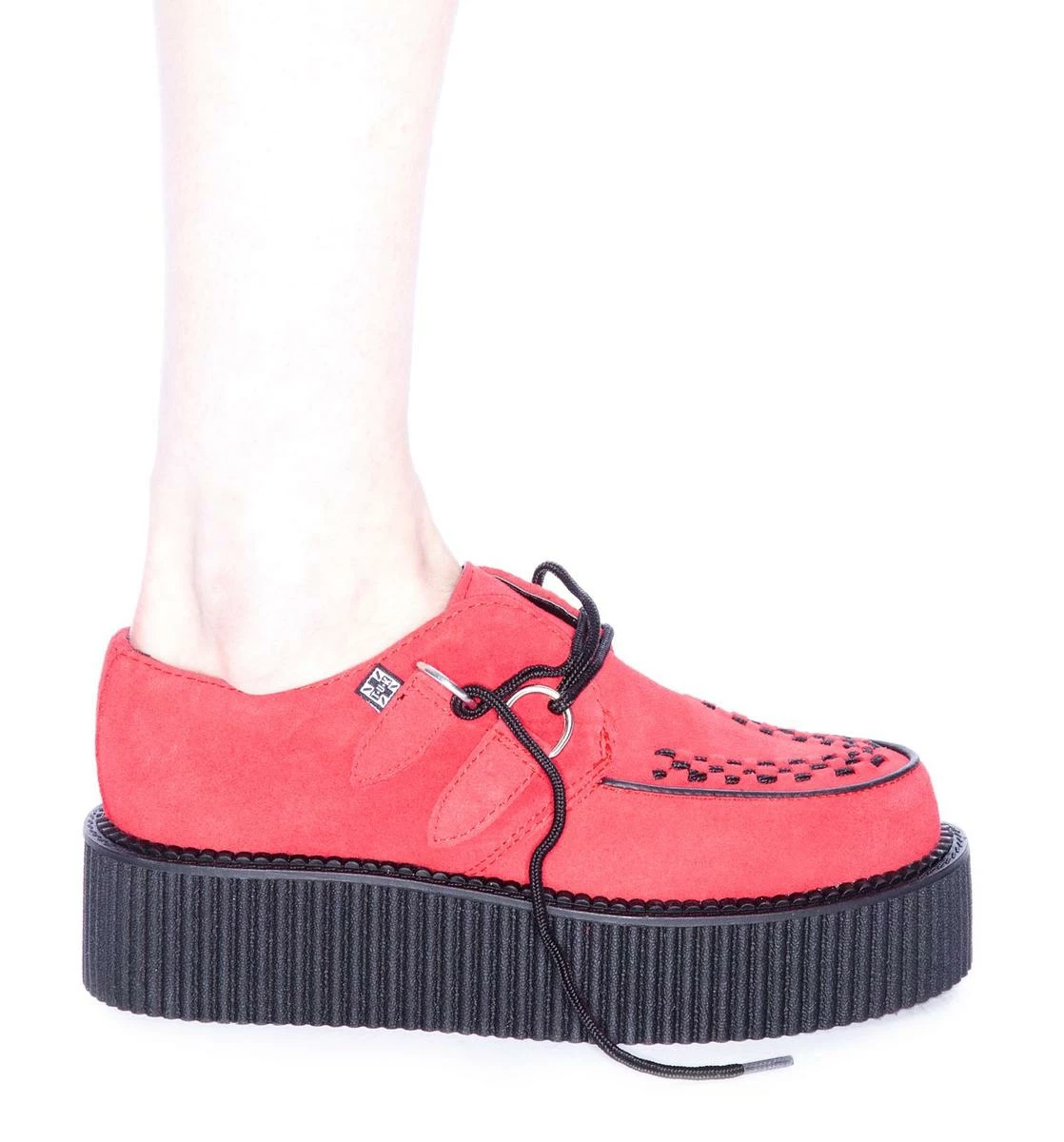 T.U.K. Red Suede Mondo Creeper, a basic creeper with a higher sole and a bright red hue. Black contrast accents make these creepers seriously business. Looks amazing with dark denim skinny jeans. We love the platform sole on these TUK creepers. The Mondo creepers are the best for giving you some extra height without making it look like your trying too hard. Totally off duty vibe with on duty color.