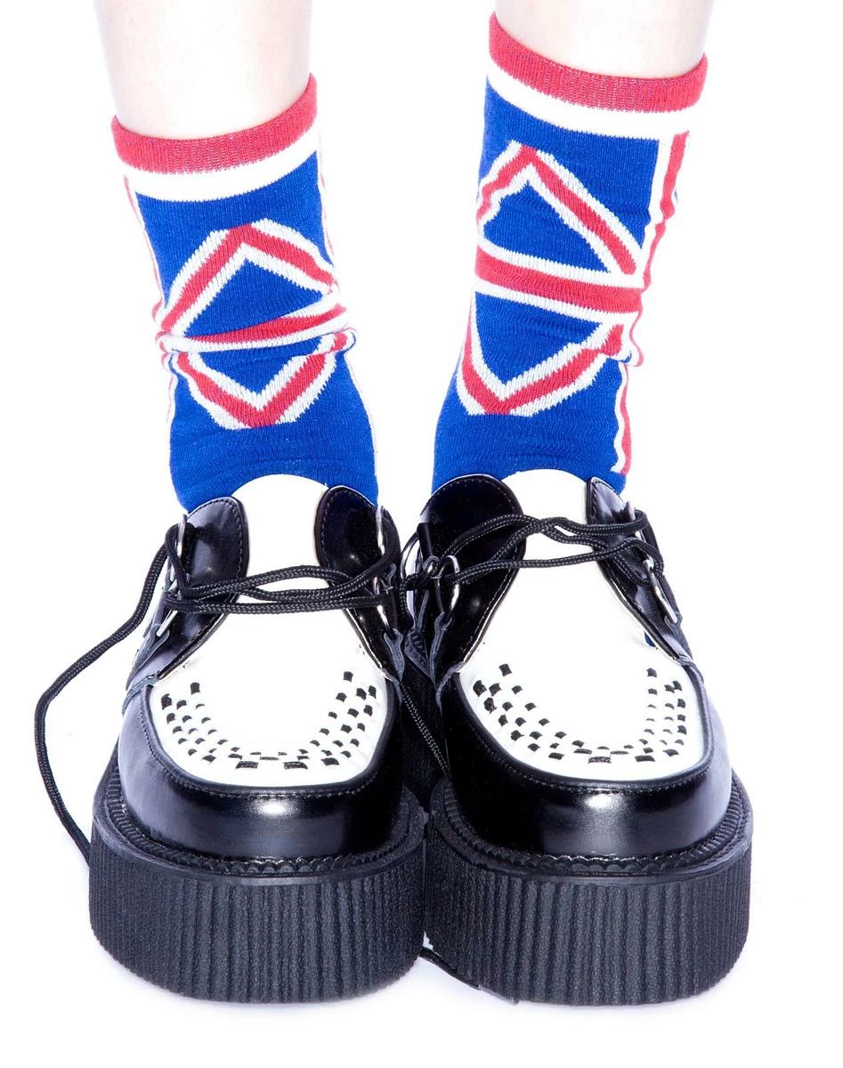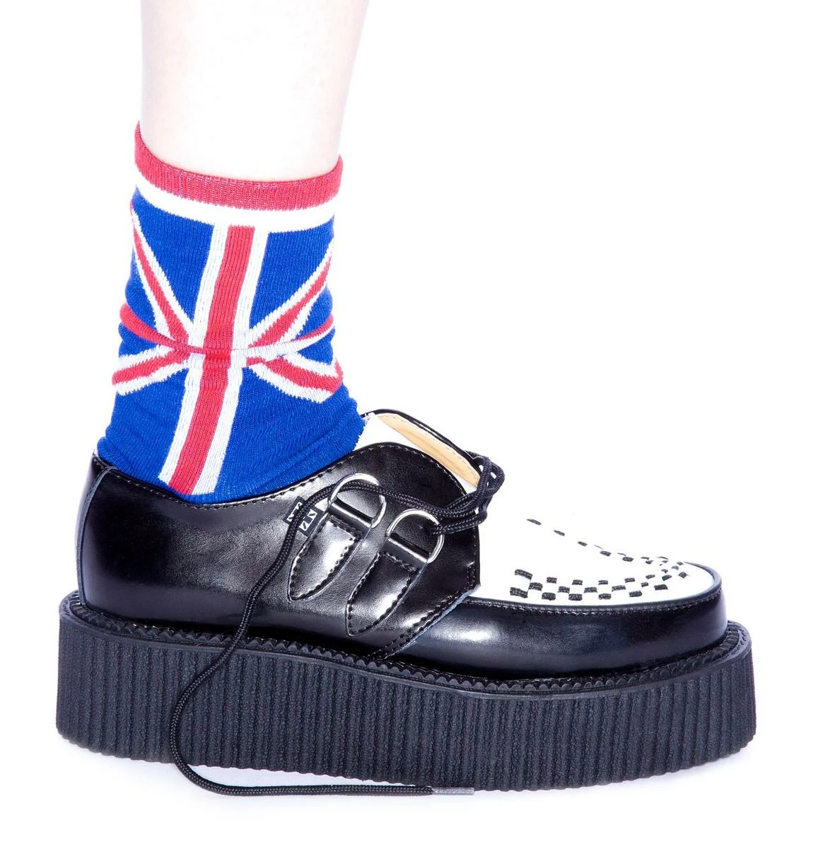 T.U.K. Rudeboy Mondo Creeper Shoe in a classic black and white leather upper. The rad style of this shoe makes it easily a uni-sex design. The shoe sizes are listed in womens, but you can easily convert for a mens fit. Leather that becomes softer with wear and a chunky platform sole. Creepers are so hot right now and these are an essential to your wardrobe. They look perfect with black skinny jeans.