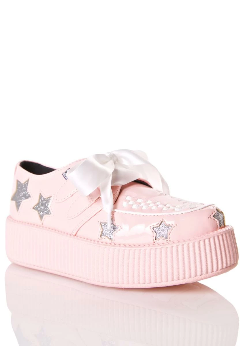 is gunna show off yer twinkle powah, bb! These super sweet eXXXclusive creepers feature a sleek baby pink patent construction, matte pink creeper sole, white vegan leather trim with interlaced details on the toe, glittery star cut outs all over, and D-ring lace-ups with pretty satin laces~