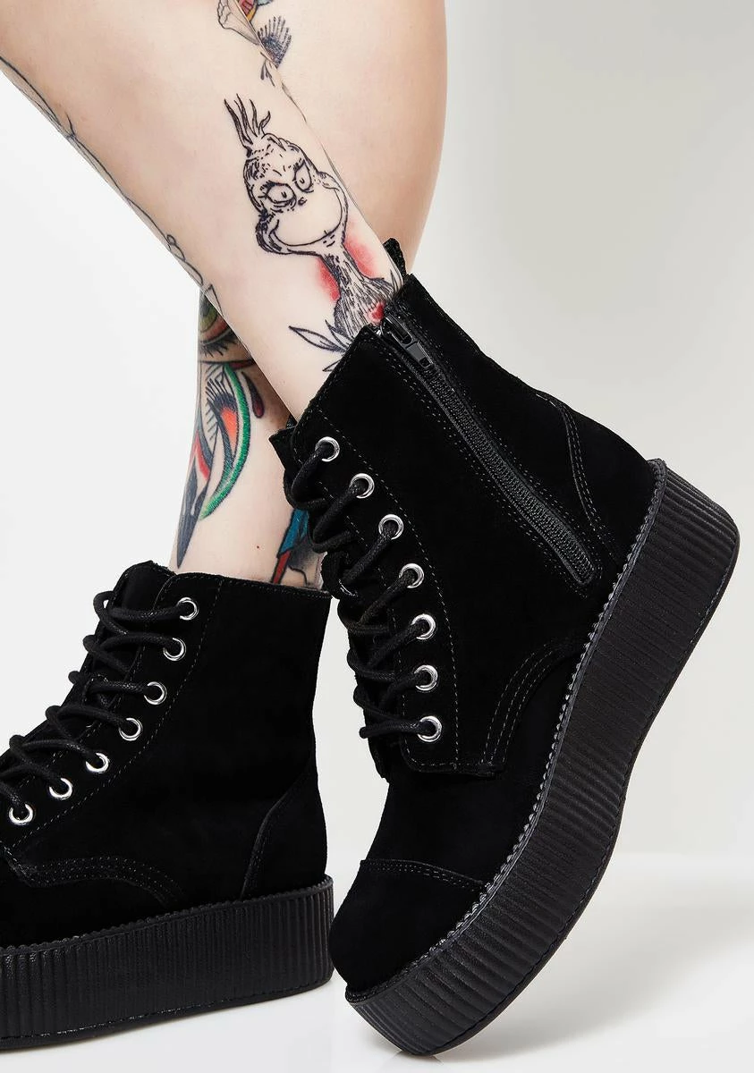 got emΓ’ΒΒ creepinΓ’ΒΒ on ya bad self. These really dope suede creeper boots that have comfy rubber platforms, lace-upz on the front and zip closures.