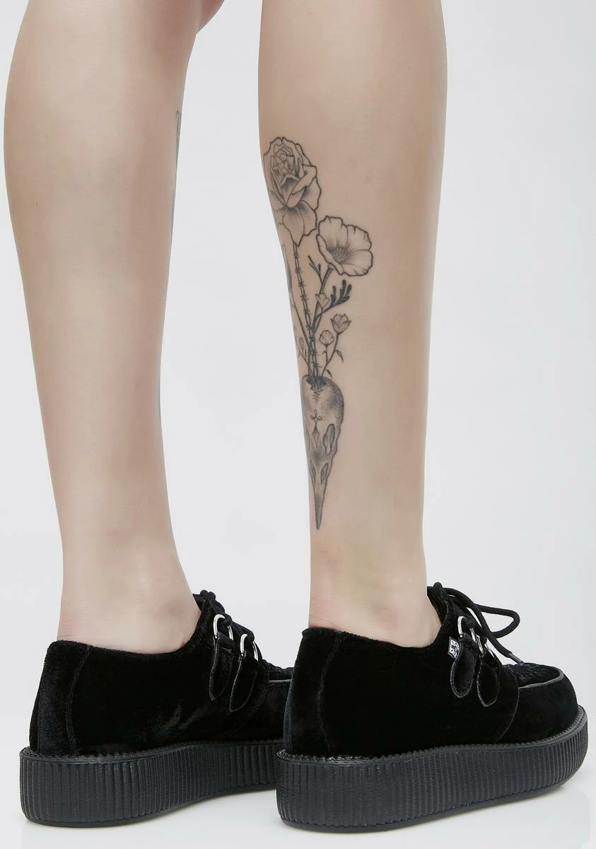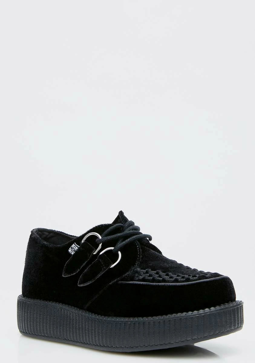 cuz youΓ’ΒΒre always sneakinΓ’ΒΒ around. These black velvet creepers have thikk black soles and lace-up front closures.