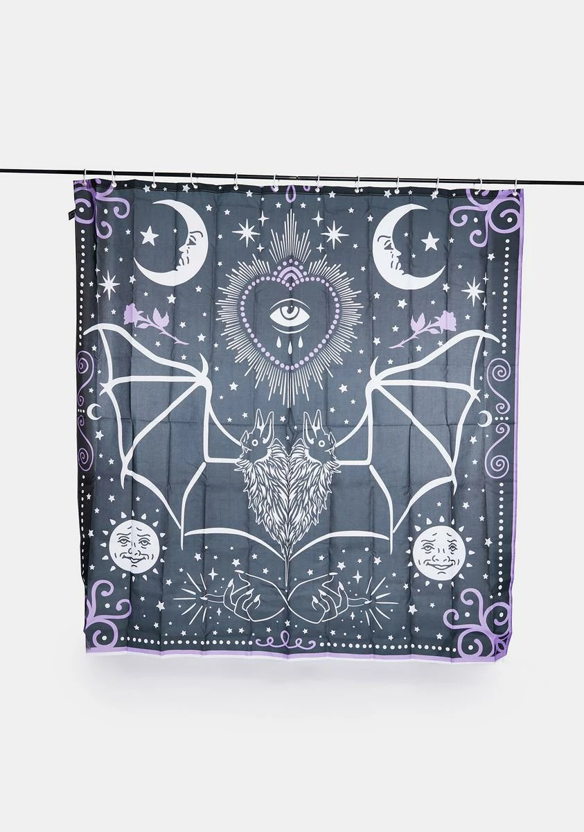 someone is watching over you. This shower curtain has bats, an all-seeing eye, rose, sun, and crescent moon graphics and rod hook hardware.