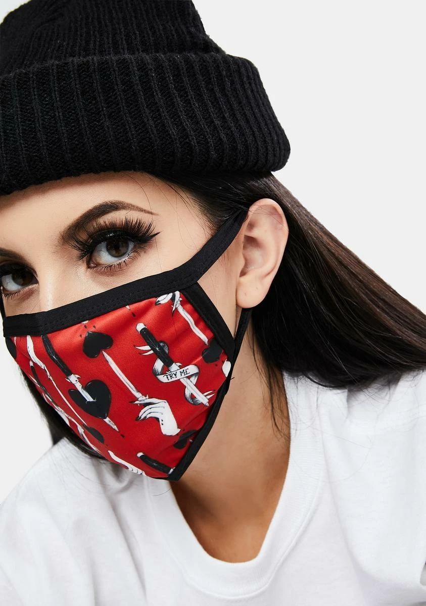 cuz you’re ready for anything. This face mask has knife and heart graphics with the phrase try me.