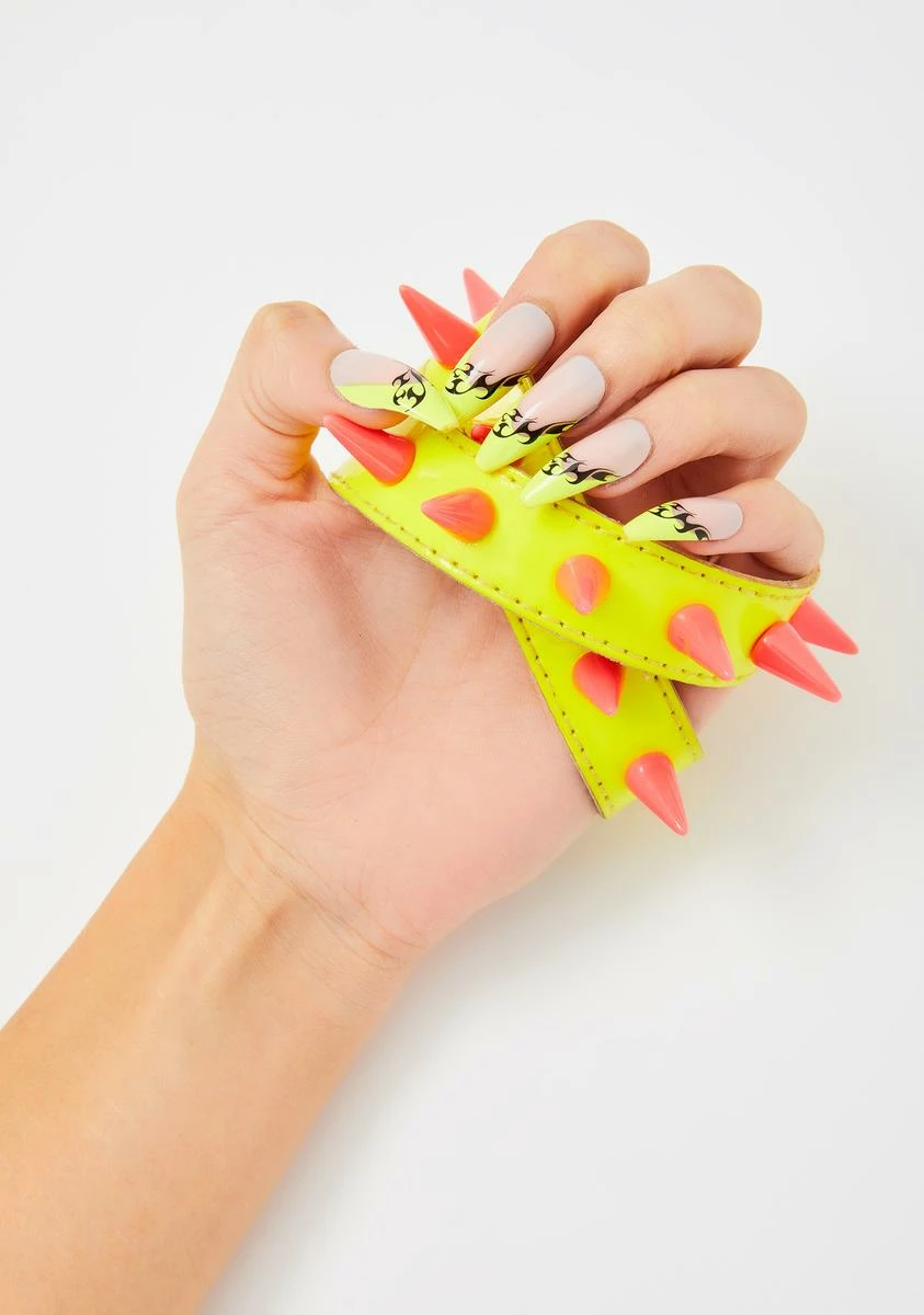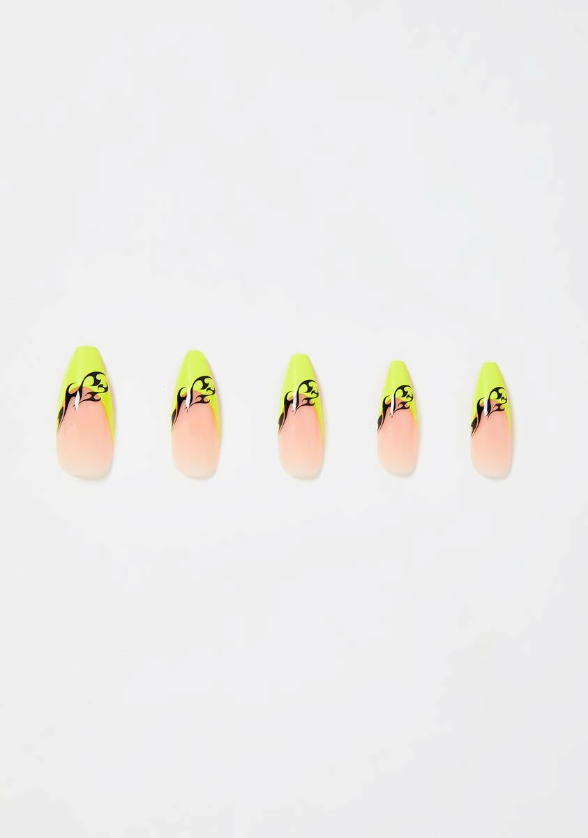 n they can keep on staring bb. Show ‘em they don’t wanna mess with you looking hot AF in these press on nails with neon french tips and tribal tattoo designs that come with a cuticle stick, nail glue and a nail file.
