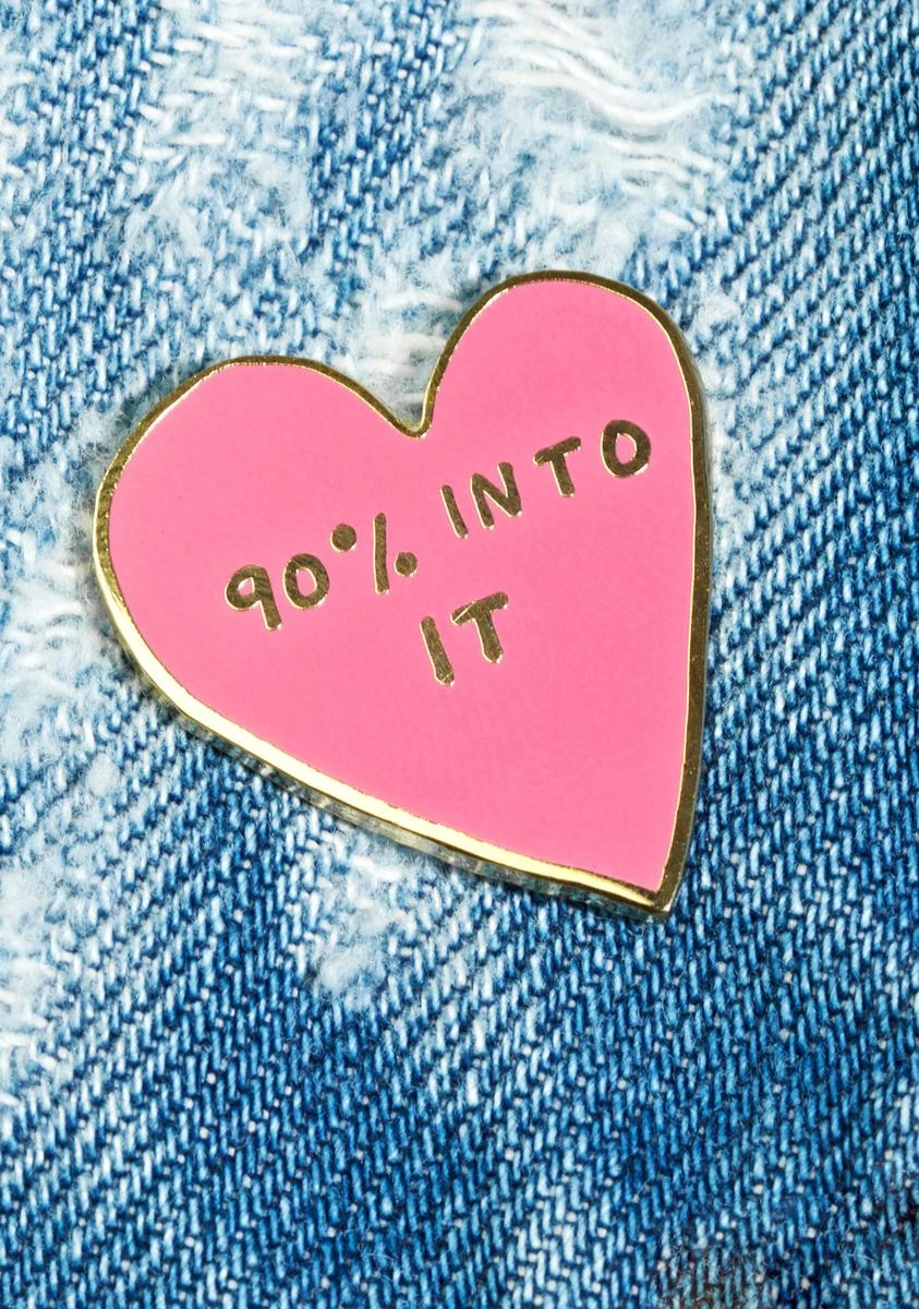 almost totally feelin’ ya, dude. Get me there. This dope enamel pin features a pink heart shape, gold fill, lettering that reads ‘90% Into It,’ and pin back closure.