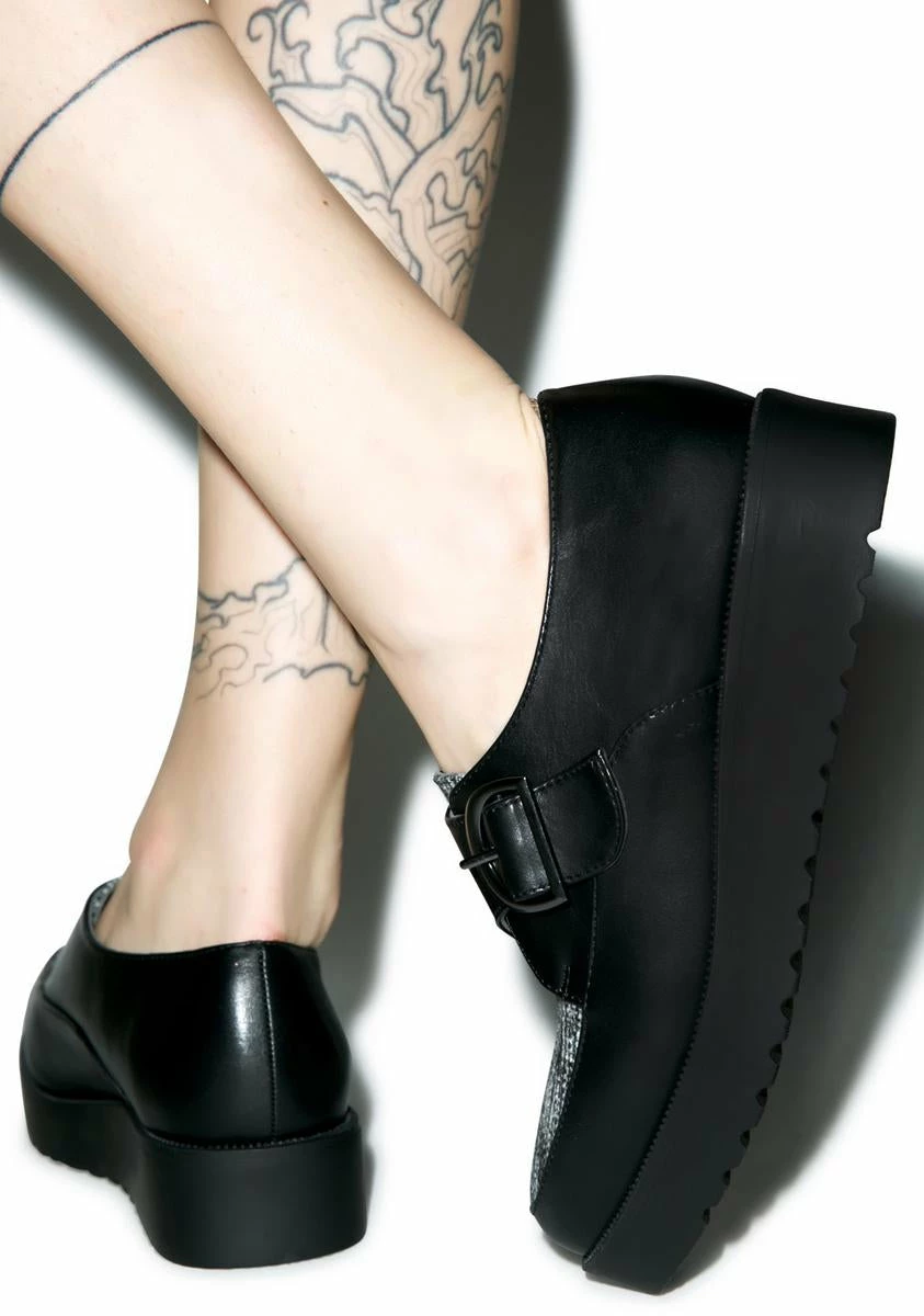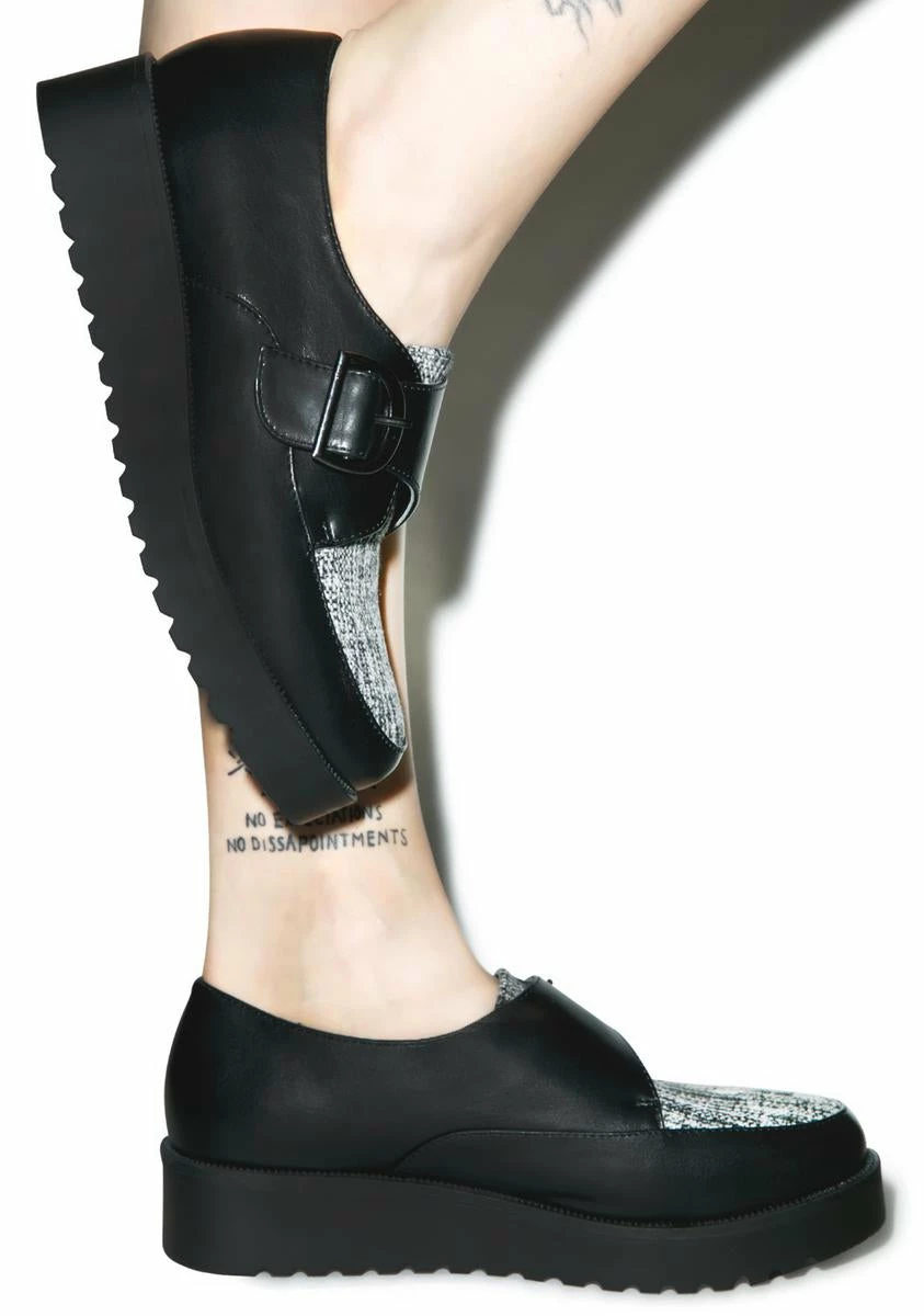 let everyone kno yer the baddest bitch on tha block in these bbs. Get ta stompinâ with these simple ân cool vegan leather creepers, featurinâ a treaded platform, slightly tapered toe, monk strap closure with simple d-ring details, and contrasting black ân white boucle style pattern on tha toe.